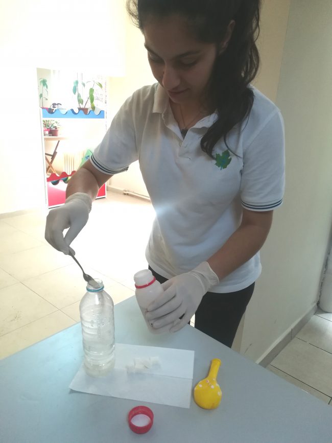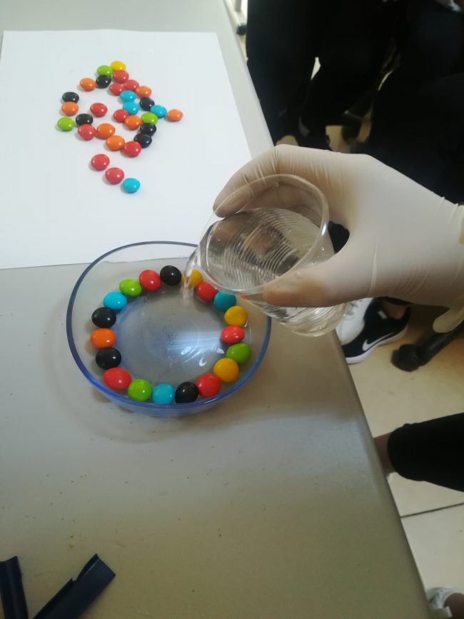 Bonibon şekerler ile yaptığımız bu deneyde üzerlerindeki boyalı maddenin su konulduğunda rengini suda olmayan yöne doğru verdiğini saptadık. Öğrencilerimiz renkli görüntülerle keyif dolu dakikalar eşliğinde deneyini gerçekleştirdi.
